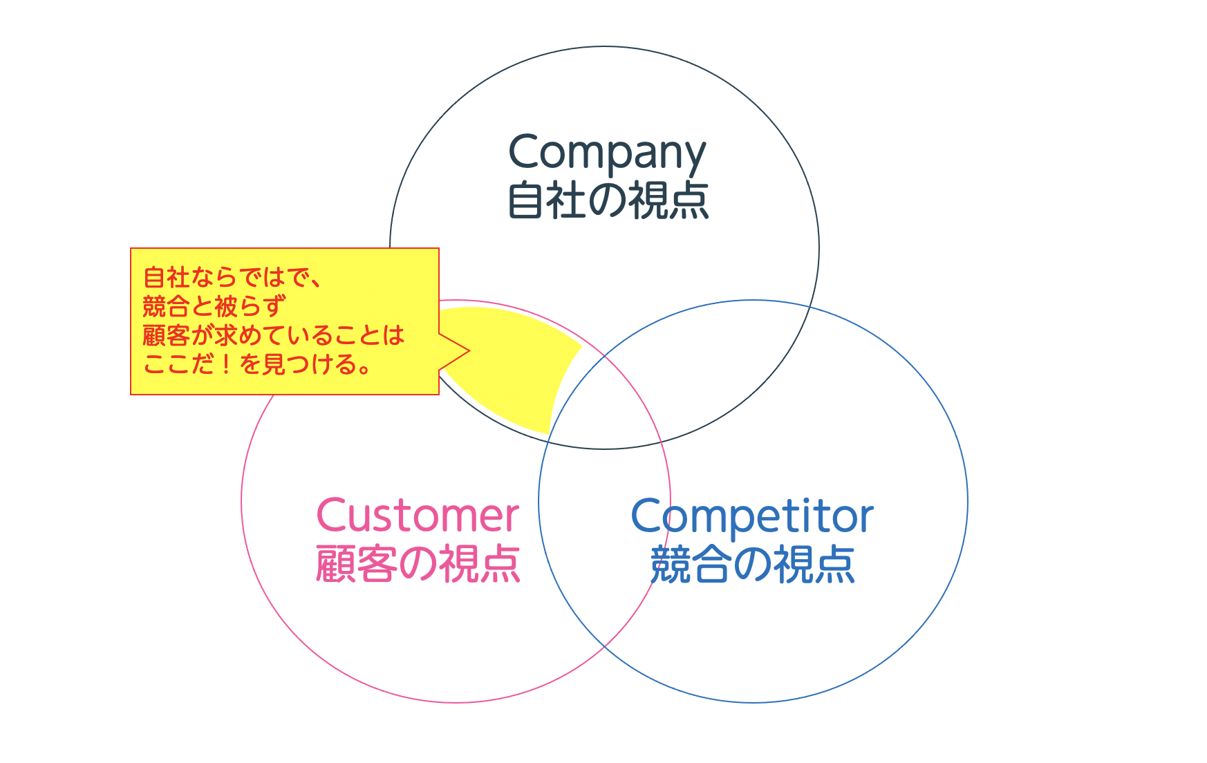 ベン図を使うと、つい重なっているところがいいところに見えてしまうが3C分析の場合はそうじゃない。